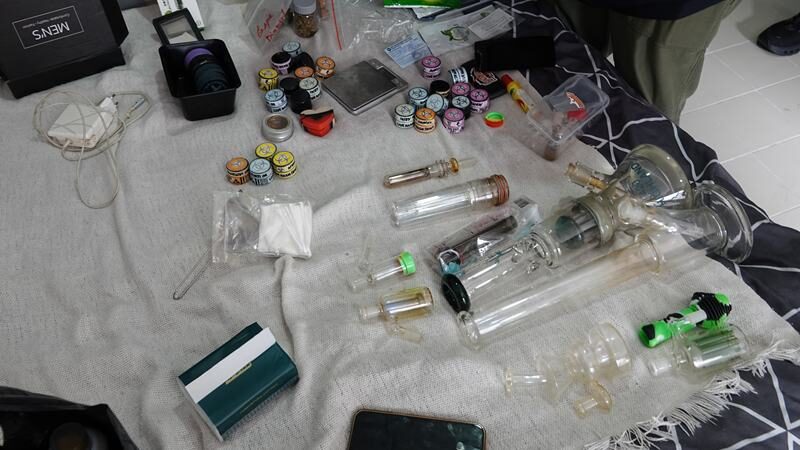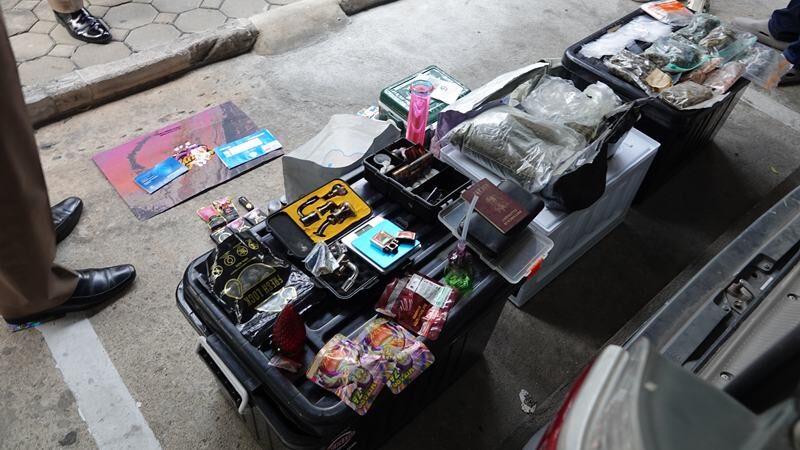ตรวจยึดของกลาง 10 รายการ ดังนี้ เงินสด 200,000 บาท รถตู้ GRANVIA สีเทา 1 คัน โน้ตบุ๊ก MacBook Pro 2 เครื่อง โทรศัพท์ 7 เครื่อง ที่เก็บข้อมูลการ์ดความจำ และแฟลชไดฟ์ 20 ชิ้น สมุดบัญชีธนาคาร 5 เล่ม ช่อดอกกัญชาไม่ทราบสายพันธ์ 41 ถุง ยางในกัญชา 25 กระปุก เมล็ดกัญชา 20 ห่อ เครื่องบดกัญชา และอุปกรณ์อื่นๆจำนวนมาก