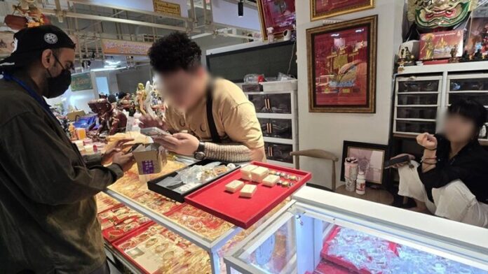 ตำรวจวางแผนกระจายกำลังเข้าตรวจสอบภายในพื้นที่เป้าหมาย และตรวจสอบแผงจำหน่ายพระเครื่อง 2 แผง โดยมีชายลักษณะคล้ายคนต่างด้าว 3 คนประจำอยู่ที่แผงพระทั้ง 2 แผง มีการพูดคุยซื้อขายพระเครื่องอ้างตนเป็นเซียนพระ รับซื้อ-ขายพระเครื่อง รวมถึงกรอบพระเนื้อทองคำและเงินอย่างเปิดเผย จึงขอตรวจสอบเอกสารประจำตัวพบว่าเป็นคนสัญชาติจีน 2 ราย อายุ 35 และ 40 ปี มีวีซ่าท่องเที่ยว ส่วนอีกคน อายุ 29 ปี มีวีซ่านักเรียน แต่ไม่มีใบอนุญาตทำงาน นอกจากนั้นยังมีลูกจ้างชาวเมียนมาอีกคน วีซ่าหมดอายุและไม่มีใบอนุญาตทำงาน